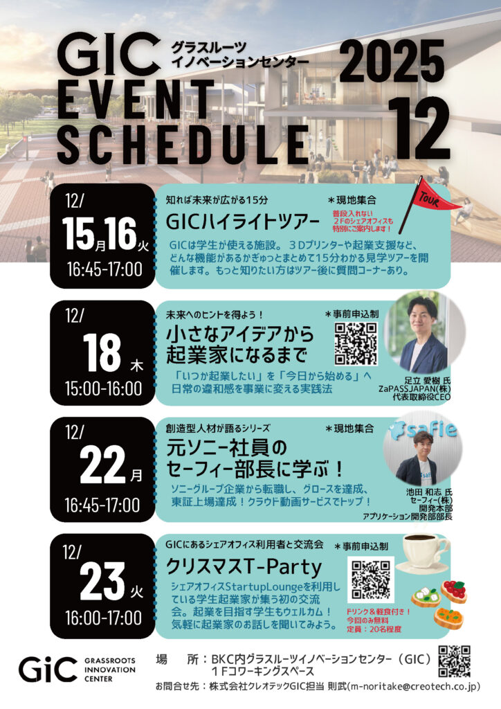 いずれも気軽に「起業」や「イノベーション」を感じ、学べる企画です!GICツアーや、スタートアップ・学生起業家などとも交流できる企画も!